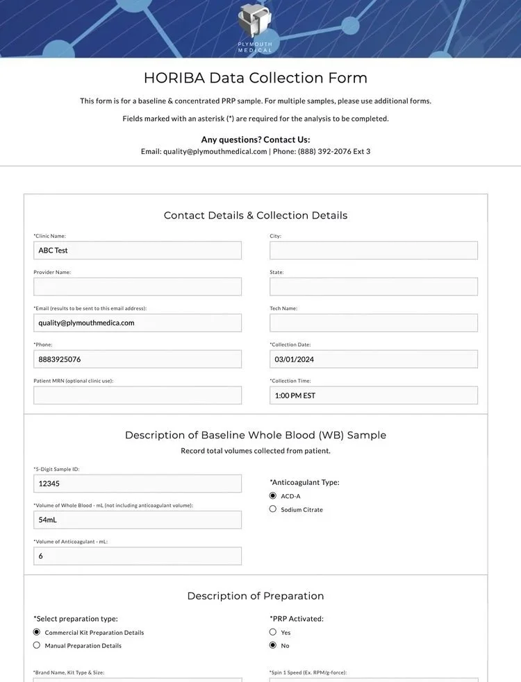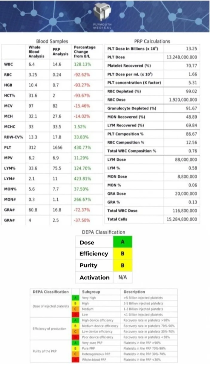 PLYMOUTH MEDICAL has leveraged our years of cell counting experience and crafted a simple, quick and cost-effective solution to receive an easy-to-interpret report outlining the dose, efficiency, purity and activation of your Platelet-Rich Plasma (PRP).