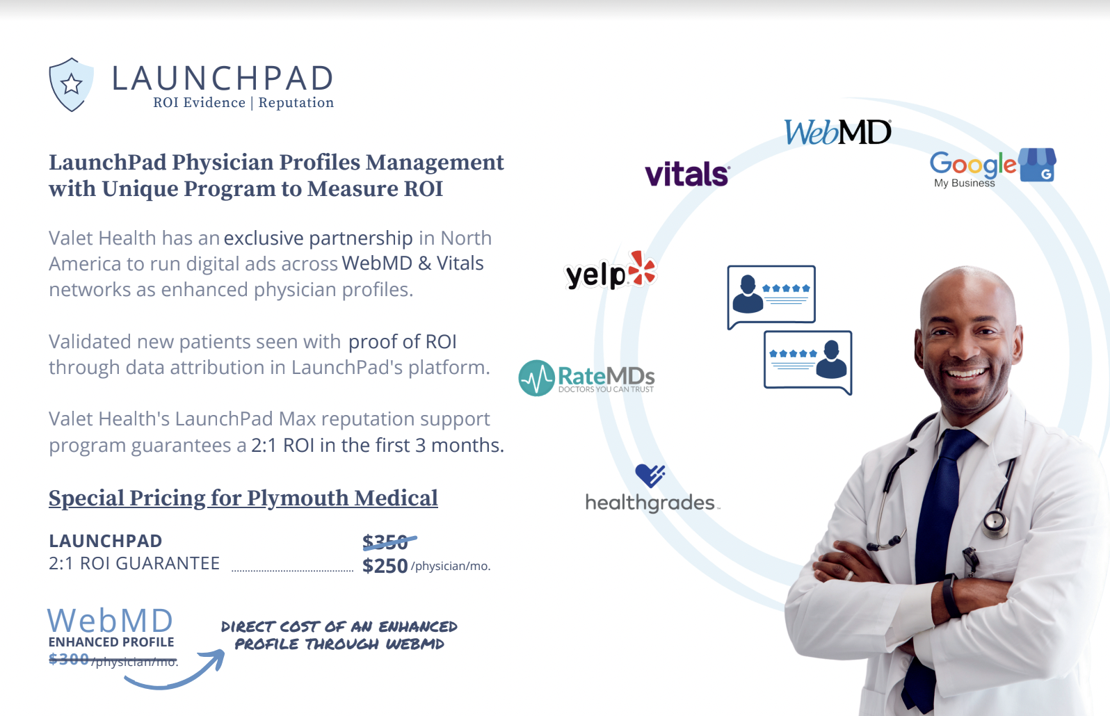 As a PLYMOUTH MEDICAL client, you have access to tried and tested digital marketing experts to ensure your online marketing initiatives deliver a healthy return on your investment with preferential pricing for enhanced WebMD profiles, website upgrades and targeted patient education. Putting your clinic above the rest is what we do best.
