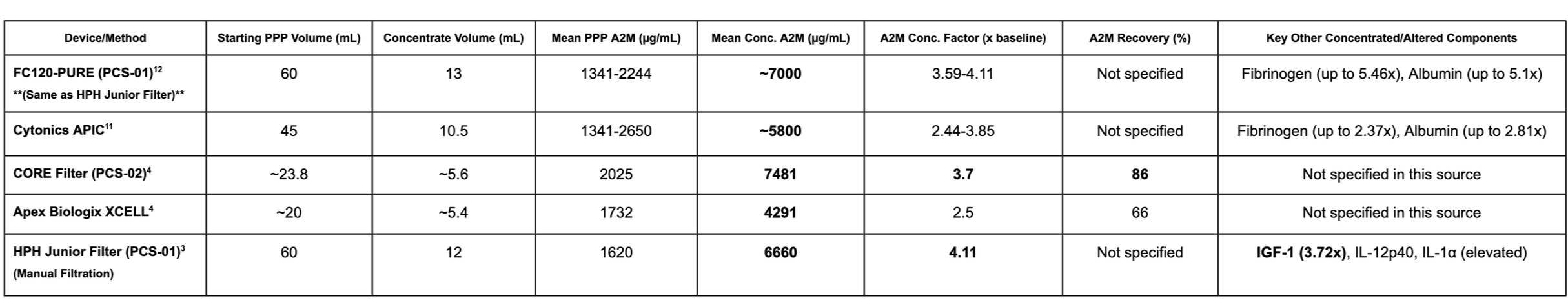 Here is a comparative table summarizing the A2M concentration and efficiency of various plasma concentrating devices, along with details on their performance:
